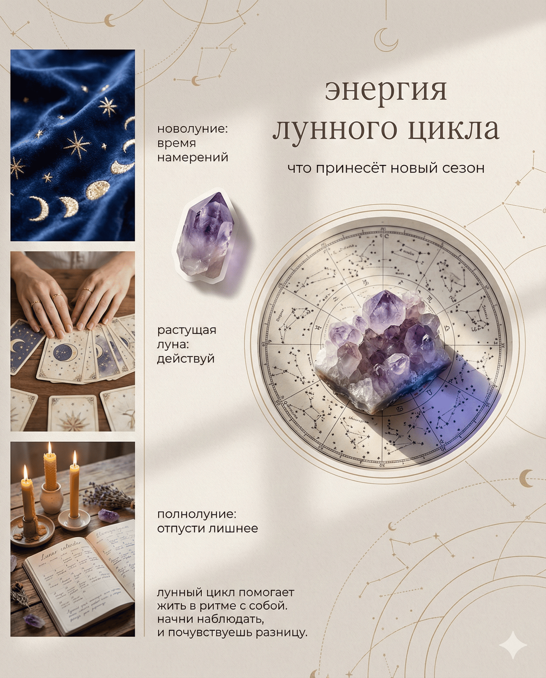 Чтобы адаптировать под себя: замени "энергия лунного цикла" на свою тему, "карту звёздного неба и кристалл" на свой главный объект, описания 3 фото на свои сцены, и тексты инсайтов на свои ключевые мысли.