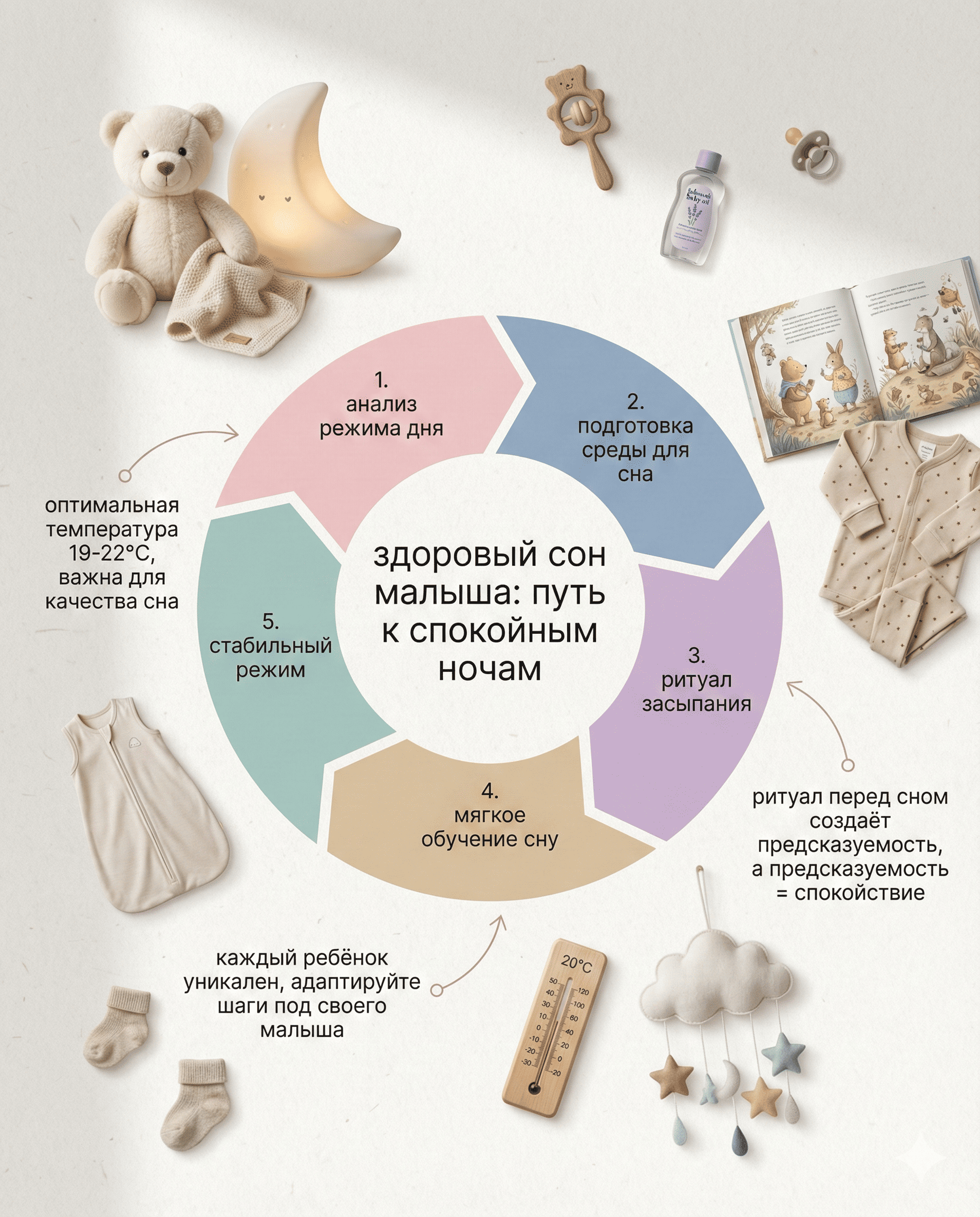 - Заголовок в центре круга: "здоровый сон малыша: путь к спокойным ночам"