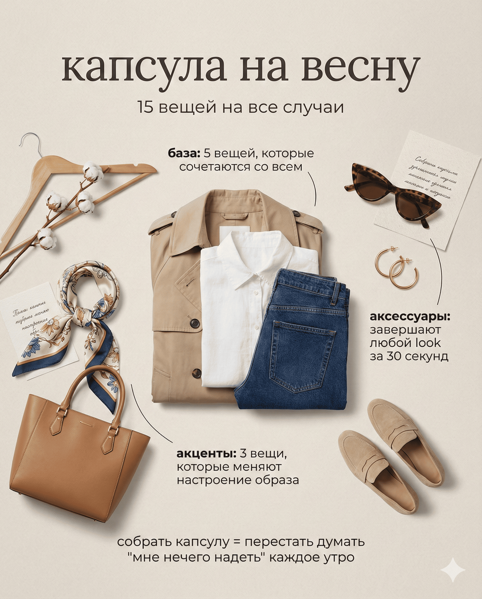 Создай премиальную инфографику для карусели в Instagram в вертикальном формате 4:5 на тему: капсульный гардероб на весну.